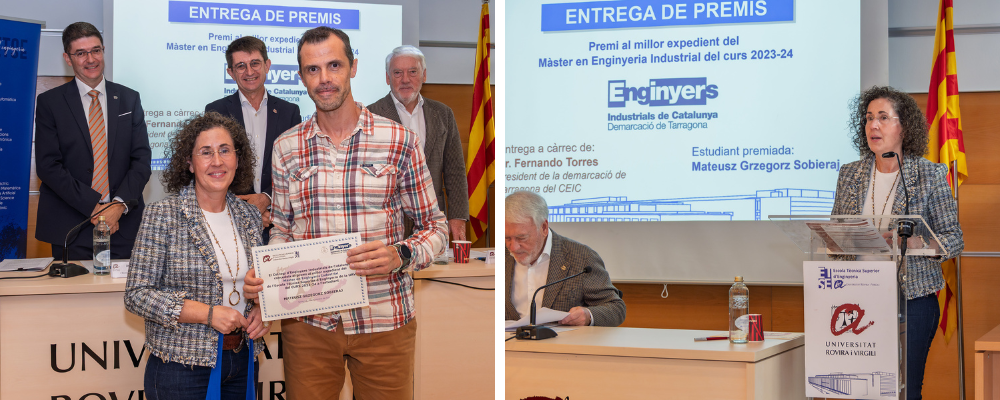 El rector va donar la paraula a la Sra. Silvia de la Flor, com a vocal de la junta de la demarcació de Tarragona del Col·legi d'Enginyers Industrials de Catalunya, (CEIC), per oferir unes paraules i lliurar el premi al millor expedient del Màster en Enginyeria Industrial (MEI) del curs 23-24 a l’estudiant Mateusz Grzegorz Sobieraj.